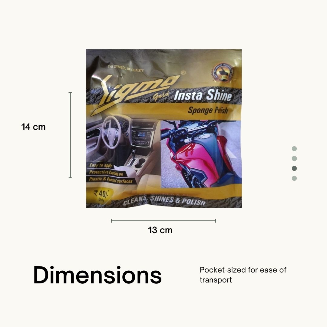 Sigma Cares Insta Shine Gold is India’s bestselling multi-surface instant shine sponge polish designed to give any surface a glossy, premium, showroom-like finish within seconds. Whether it's your car exterior, dashboard, bike body parts, helmets, laptops, shoes, or decorative items, Insta Shine Gold works perfectly across all surfaces to restore shine and protection.